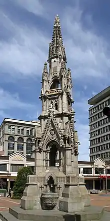 The monument was designed by Charles Robert Swyer and built in 1863–64, using Tasmanian sandstone,[1] on a base of locally sourced phonolite.[2] The design, in Gothic Revival style, was likely partly inspired by Edinburgh's Scott Monument,[3] and features delicate carved lacework and grotesques. Its design was compared by contemporary architect Nathaniel Wales to that of England's Eleanor crosses.[2] The design also originally featured drinking fountains, but they have been unused for many years.