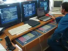 The cargo control room, CCR, or cargo office of a tankship is where the person in charge (PIC) can monitor and control the loading and unloading of the ship's liquid cargo. Prevalent on automated vessels, the CCR may be in its own room, or located on the ship's bridge.[1][2] Among other things, the equipment in the CCR may allow the person in charge to control cargo and stripping pumps, control and monitor valve positions, and monitor cargo tank liquid levels.