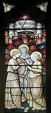 In December 1873 he began to get work from the new Lancaster firm of Shrigley and Hunt, both as a stained-glass designer and a decorative artist in other media, and in 1876 he became a permanent employee and moved to Lancaster. Here the firm's founder, Arthur William Hunt, and his two chief designers, Almquist and Edward Holmes Jewitt, worked as a close team, drawing particularly on the Aesthetic techniques Almquist had derived from Holiday and from Harry Ellis Wooldridge of the James Powell studio; they developed a house style of subtle colours (becoming richer in later years) and delicate drawing which defined Shrigley and Hunt until well into the 20th century.[2][5] Almquist soon found he much preferred life in London, so to keep the company together Hunt opened a London branch for him in 1878.[2] Almquist was still not finished with education, and from 1878 to 1884 attended the West London School of Art.[6][7] This culminated with his being awarded a travelling scholarship to spend two months in Italy studying decorative art.[8] As the years passed his style developed, with the Pre-Raphaelite influence becoming less obvious and those of Botticelli, Dürer and contemporary Scottish glass designers more so.[9] Almquist designed many windows for locations in Scotland, Wales, the Home Counties, Yorkshire, and above all in the north-west of England, and there are scattered examples elsewhere.[10] Though he never returned to Sweden[3] he designed several of the stained glass windows for the St Nicholas Church, Örebro, then being restored by his old friend Adolf Kjellström,[11] and later for the Olaus Petri Church in the same town.[3][12] Stylistic evidence also suggests that while employed by Shrigley and Hunt Almquist did some freelance work for the firm of Burlison and Grylls.[13]