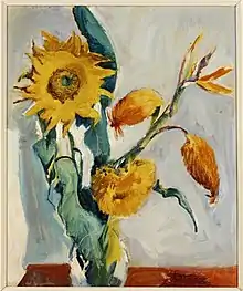His subjects varied widely: cityscapes of New York and landscapes of the Maine woods and tropical settings; human figures, including city laborers and rural woodsmen, as well as urban sophisticates; Scandinavian farm scenes; floral still lifes.[1][60][70] Although his pictures of the Maine woods drew most attention after his death, he was better known for his still lifes and drawings during most of his career.[6] Sprinchorn's "Sunflowers and Tritoma" (shown at right) illustrates is handling of a floral still life. In 1936 a critic said this painting was the liveliest of the "vivid flower paintings" he showed at the Sullivan gallery.[52]
