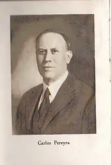 Carlos Hilario Pereyra Gómez (Saltillo, Coahuila 1871 – Madrid, Spain 1942) was a Mexican lawyer, diplomat, writer and historian. His background was highly influenced by late 19th century Positivism, so this influence is denoted in his works. He was also a Hispanist, defender of the historical and cultural legacy of Spain in Spanish America and critic of the American Interventionism policy in Latin America.