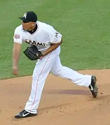 His first start as a member of the Marlins was against the Cincinnati Reds. He pitched six innings with six strikeouts, allowed four hits, including a home run in a no decision. In that same game, Zambrano also got his first base hit as a Marlin.[71] After an 0–2 start in his first four starts, Zambrano got his first win as a Marlin against the Houston Astros. He pitched a complete game shutout with nine strikeouts, a walk, and only three hits.[72] Zambrano finished the 2012 season with a 7–10 record with a 4.49 ERA.
