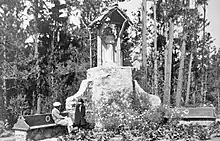 A shrine with a wooded statue of Padre Junípero Serra was installed at the entrance to the development, at the intersection of Camino del Monte and Alta Avenue in the community of Carmel Woods. The statue was carved and painted by the local artist Jo Mora (1876-1947), and displayed within a small wooden shrine, surrounded by plants and a pair of wooden benches. The opening day, coincided with the Serra festival featuring Garnet Holme's Carmel Mission play Serra, at the Forest Theater.[5]