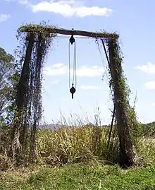 Standing between 7 and 9 metres (23 and 30 ft) high, the lift comprises two upright poles supporting a horizontal cross beam. The beam comprises an unfinished wooden log. The upright poles are covered with a climbing vine.[1]