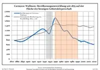 Development of Population since 1875 within the Current Boundaries (Blue Line: Population; Dotted Line: Comparison to Population Development of Brandenburg state; Grey Background: Time of Nazi rule; Red Background: Time of Communist rule)