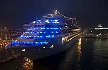 Carnival Liberty is a Conquest-class cruise ship operated by Carnival Cruise Line. Built by Fincantieri at its Monfalcone shipyard in Friuli-Venezia Giulia, northern Italy, she was christened by actress Mira Sorvino in Civitavecchia, Italy, on July 19, 2005.[5][3][6] Carnival Liberty was the first ship to feature Carnival's Seaside Theater—a 12-foot (3.7 m) high by 22-foot (6.7 m) wide LED screen. Located by the midship pool on the Lido deck, it is used to show movies, sporting events, concerts and other ship programming.[7]