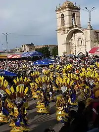 La Diablada Carnival takes place in Oruro in central Bolivia. It is celebrated in honor of the miners' patron saint, Vírgen de Socavon (the Virgin of the Tunnels). Over 50 parade groups dance, sing, and play music over a five kilometre-long course. Participants dress up as demons, devils, angels, Incas, and Spanish conquistadors. Dances include caporales and tinkus. The parade runs from morning until late at night, 18 hours a day, for three days before Ash Wednesday. It was declared the 2001 "Masterpieces of Oral Heritage and Intangible Heritage of Humanity" by UNESCO.[62] Throughout the country, celebrations are held involving traditional rhythms and water parties. In Santa Cruz de la Sierra, on the east side of the country, tropical weather allows a Brazilian-type Carnival, with Comparsas dancing traditional songs in matching uniforms.