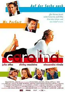 Carolina is a 2003 American-German romantic comedy film directed by Marleen Gorris, starring Julia Stiles, Shirley MacLaine, Alessandro Nivola, Mika Boorem, Randy Quaid, and Jennifer Coolidge.[1] Lisa Sheridan has a cameo role in the film, and Barbara Eden has the uncredited part of Daphne.[2] It is set in Los Angeles, California. Shot in 2003, the film failed to find a distributor and was released direct-to-video in 2004.