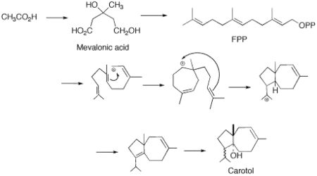 It has been proposed that there is a direct cyclisation of farnesyl pyrophosphate (FPP) to the carotol (carotane backbone). This type of cyclisation is unconventional for the typical chemistry of sesquiterpenes. The only other proposed mechanism requires a complex ten-membered ring with a methyl migration. This latter reaction, regardless of how plausible it may appear to be on paper, is energetically undesired, and through the diligent work of M. Soucek and coworkers, it was shown that the cyclization from FPP to carotol is the most probable biosynthesis route.[4]