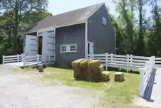 On the museum grounds is a reproduction of a 1746 post-and-beam barn constructed in 1993 with a community barn raising in celebration of Rehoboth's 350th anniversary. The wood used in the construction was "red and white oaks and white pines from the land of E. Otis Dyer" collected in the fall of 1992. E. Otis Dyer is a long term supporter of the Rehoboth Antiquarian Society and the barn was named in his honor.[1] The official name of the barn is the E. Otis Dyer Barn. [8]
