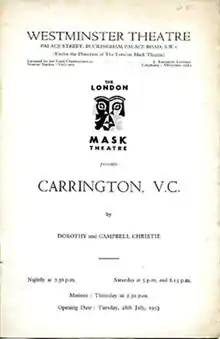 Carrington VC is a 1953 stage play by husband and wife playwrights Campbell and Dorothy Christie. The production premiered on the West End in London at the Westminster Theatre. It was directed by Michael MacOwan and starred Alec Clunes, John Wood, John Garside, Allan Cuthbertson, Lionel Jeffries, and Rachel Gurney.[1] A resounding success, the play was adapted for film in 1954.[2]