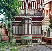 The main door of the house, next to the covered porch, comes from the 1925 renovation, as it used to be on the street facade. Elevated above the ground, it is accessed by a stairway which has a metal railing. The door has two hinges on the sides made of cast iron with floral motifs. The doorway is shaped like a rectilinear mitral arch, decorated with large teardrop-shaped sculptures hanging from the ceiling. In the 1925 renovation, a terrace was placed in front of the door, which was removed in the 2017 restoration. Above the door is a cast iron lamp with plant motifs.[93]