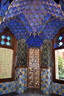 Access to the house is through the main floor (162 m²), which contains a foyer, dining room, porch and smoking room as the main rooms.[103] The front door gives access to a porch, through which the foyer is accessed. The door is made of wood, decorated with a grid in which circular mouldings have been inserted.[104] The foyer has a roof made from wooden beams with polychrome mouldings, as well as sgraffito on the walls showing plant motifs. From the ceiling hangs a cast iron and glass lamp, Islamic in style, which came after the work of Gaudí.[105]