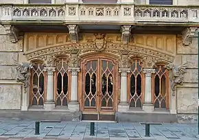Of great importance is the complex decorative apparatus of the main façades characterized by the extensive use of elements in cement, allegorical and zoomorphic decorations, including the pair of large dragons flanking the large wooden entrance portal; it is precisely the presence of these decorative elements that, over the years, has earned it the name of "House of Dragons" ("Casa dei Draghi").[8] The decoration begins at the base of the main façades, simulating a stone ashlar with horizontal bands extending up to the main floor. At this level the windows are enriched by a frame which at the base bears coats of arms depicting allegorical figures that mark the façade, alternating with the pairs of dragons, symbolic representations of power and prestige that support the balustrades of the balconies on the upper floor.[9] The remaining arched windows show simpler frames, while the two large central bay windows have round mullioned windows and also culminate with a terrace.