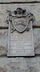 - The inscription reads: NEI MOMENTI PIÙ TORBIDI / DEL DOPO GUERRA / IL CAVALIERE DEL LAVORO / GIOVAMBATTISTA CARRERA / DI MAGNANO BIELLA / COSTRUIVA / QUESTO MONUMENTALE PALAZZO / A RICORDO / DELLA GRANDE VITTORIA ITALIANA. / MCMXX