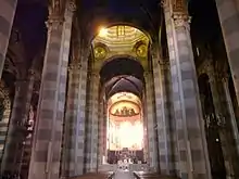 The cathedral has a narthex. The interior has five naves, of which the central one is marked by tall polychrome columns rising two storeys. The ceilings are frescoed, sometimes sky blue.