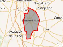 Casamassima (Barese: Casamàsseme) is a town and comune of 19,786 inhabitants in the Metropolitan City of Bari, in Apulia, southern Italy. Is also called "The Blue Town". The town is located inland from the Italian coastline, thrives and is built on agriculture, primarily that of wine, olives and almond production. Founded around the seventh and eighth centuries, the village started as a Roman encampment, according to legend.