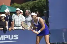 Dellacqua's first event outside of Australia for 2014 was the Indian Wells Open. Seeded fourth in the qualifying draw, Dellacqua defeated Anna Tatishvili and Johanna Konta to qualify for the main draw.[24] Dellacqua then defeated Christina McHale[25] 19th seed Kirsten Flipkens[26] and 13th seed Roberta Vinci before receiving a walkover Lauren Davis in the fourth round. In the quarterfinals, Dellacqua lost to 6th seed Simona Halep in straight sets. This was Dellacqua's best singles performance to date.[27] She also reached the quarterfinals of the doubles event with Ashleigh Barty but the pair lost in straight sets to the top seeds, Hsieh Su-wei and Peng Shuai. She was due to meet Halep again in the second round of the Miami Open, but the Romanian withdrew from the tournament due to injury; instead, Dellacqua faced lucky loser Jana Čepelová, and won in three sets, thus setting up a meeting with 29th seed and former world No. 1, Venus Williams;[28] Dellacqua lost in three sets.[29] In the doubles event, Dellacqua and Barty lost in the first round in three sets to Alla Kudryavtseva and Anastasia Rodionova.