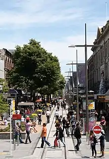 City Mall is the main pedestrian mall in the central city of Christchurch, New Zealand, comprising two sections of Cashel Street plus the Bridge of Remembrance and one section of High Street. It is also known as Cashel Mall.[1][2][3][4] The Bridge of Remembrance was pedestrianised in 1976. The main mall was closed to traffic on 11 January 1982 and formally reopened as a pedestrian mall on 7 August, but it was not until 1992 that the entire mall was paved. The mall was redeveloped between 2006 and 2009, and track was installed for an expansion of the heritage tram network.