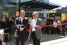 In April 2011, it was announced that part of Cashel Street was to reopen on 29 October 2011.[34] Temporary shops made from shipping containers were fitted out as retail premises, accommodating 27 shops known as Re:START.[35] Ballantynes, Christchurch's remaining department store, also reopened and is the retail anchor. Prime Minister John Key officiated at the opening ceremony.[36]