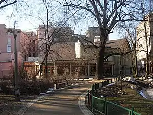 At this time, many species were growing in the park, including park include:[1] elms, sessile oaks, pyramidal English oaks, ailanthi, horse-chestnuts, sugar maples, maple trees, birches, Siberian peashrubs, purple hazels, purple European beeches, Kentucky coffeetrees, grandiflora hortensias, kerrias, magnolias, American sycamores, peony bushes, black locusts, robinias, snowberry bushes, large-leaved lindens, small-leaved lindens, yews, pines, black pines, Caucasian walnuts, cypresses, London planetrees and other trees and shrubs.