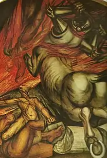 The former gaming room in the main hall came to be called the Salón de los Murales. The Spanish Republican artist Josep Renau painted a mural there of "La Hispanidad" a history of the Iberian Peninsula from the time of the Phoenicians to the conquest of America. The other side of the room held a 1965 mural by José Reyes Meza that depicted indigenous culture in the Valley of Mexico. The hall also had a mural of The Apocalypse by Jorge Flores, a disciple of David Alfaro Siqueiros.[11] Renau's Mural de la conformacion hispanica, painted with his wife Manuela Ballester(es), depicted the conquest and colonization of America by the Spanish and covered more than 300 square metres (3,200 sq ft).[16] The walls of the rooms and corridors also held the work of David Alfaro Siqueiros, Dr. Atl, Benito Messeguer, Jorge González Camarena, Francisco Icaza, Victor Moscoso and others.[17][18]