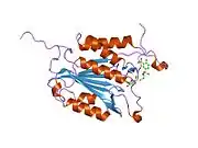 The CASP3 protein is a member of the cysteine-aspartic acid protease (caspase) family.[5] Sequential activation of caspases plays a central role in the execution-phase of cell apoptosis. Caspases exist as inactive proenzymes that undergo proteolytic processing at conserved aspartic residues to produce two subunits, large and small, that dimerize to form the active enzyme. This protein cleaves and activates caspases 6 and 7; and the protein itself is processed and activated by caspases 8, 9, and 10. It is the predominant caspase involved in the cleavage of amyloid-beta 4A precursor protein, which is associated with neuronal death in Alzheimer's disease.[6] Alternative splicing of this gene results in two transcript variants that encode the same protein.[7]