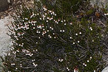 This heather is native to subalpine areas of western North America, from Alaska to the mountains of California. It is a small, branching shrub which forms patches along the ground and in rocky crevices.[1]