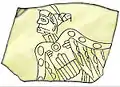 Myer also found a cache of over thirty[13] engraved shell gorgets, several of which are now held by the N.M.A.I. The most important of the gorgets is carved in what is known as the Eddyville or Braden style, believed to have been associated with the Cahokia polity near Collinsville, Illinois. The gorget depicts a warrior figure holding a ceremonial mace in his left hand and severed head in his right. The figure also has the Forked Eye Surround Motif, the Bellows apron motif and the Bi-Lobed Arrow Motif, all of which are associated with the S.E.C.C. Falcon dancer. Although the design is often shown with the figure upright, holes drilled in the edge of the gorget for its suspension as a neck ornament show it was meant to be seen with the figure oriented sideways, although it is as yet unclear what this may signify.[14] Also in the cache were two Cox style and two Nashville I style gorgets.[13][15]