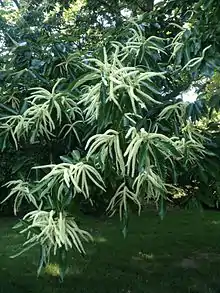 When cultivated close to other species of chestnut (including Japanese chestnut, C. crenata; American chestnut, C. dentata; and sweet chestnut, C. sativa), Chinese chestnut readily cross-pollinates with them to form hybrids.[4]