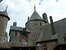 The design of the towers was influenced by the work of the contemporary French architect Eugène Viollet-le-Duc, including his restorations of Carcassonne and the châteaus of Aigle and Chillon.[30] While the exterior of Castell Coch is relatively true to English 13th-century medieval design—albeit heavily influenced by the Gothic Revival movement—the inclusion of the conical roofs, which more closely resemble those of fortifications in France or Switzerland than Britain, is historically inaccurate.[30][78][91][92] Although he mounted a historical defence (see box), Burges chose the roofs mainly for architectural effect, arguing that they appeared "more picturesque", and to provide additional room for accommodation in the castle.[91]