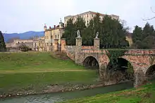 It had its origins in a simple villa that was rebuilt and extravagantly enlarged in the manner of a feudal castle from 1570 onwards by Marquess Pio Enea I degli Obizzi, a member of an Italian noble family of French origin. The house contains a vast cycle of historical battle scenes frescoed in 15711572 by Giambattista Zelotti, a pupil of Paolo Veronese. He began with events from the Roman age, culminating with the military triumphs of Pio Enea degli Obizzi, which were recreated in the gardens with tourneys and spectacles. His nephew Pio Enea II enlarged the complex with the grand entrance courtyard, announced by sculptures on high drum pedestals, which is dominated by the Baroque "Elephant" fountain.