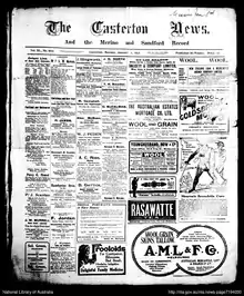 The Casterton News and the Merino and Sandford Record[1] was established in 1869. It later moved to Portland and was published as the Western Advertiser. In 1982, the Spectator-Observer Group bought it to again serve as the local paper for Casterton and in 1989 the name reverted to the Casterton News. The paper covers the areas rounding Casterton, Coleraine, Merino, Chetwynd, Portland, Hamilton, Heywood, Edenhope, Dartmoor and Mount Gambier.[2] Alternative titles for the publication include: Casterton news and Western Shires Advertiser, and Casterton News, Western Shires Advertiser and the Merino and Sandford Record, Casterton News and Western Shires advertiser and the Aspley, Edenhope and Harrow Advertiser.[3]