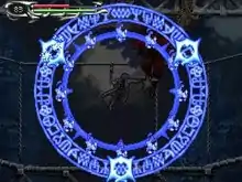 The Magic Seal system is a new feature introduced in Dawn of Sorrow that uses the DS touchscreen.[11] Once the player reduces the hit points of a "boss" enemy to zero, a circle will appear, and the game will automatically draw a pattern connecting any number of smaller circles on the circumference of the larger circle.[13] After this, the player is prompted to draw the same pattern on the touchscreen in a set amount of time.[4] If the player fails to draw the pattern accurately within the time limit, the boss will regain health and the battle will resume.[14] If successful, the boss will be defeated.[14] More powerful boss enemies require higher level Magic Seals, which have more intricate and complex patterns as the level increases and are found over the course of the game.