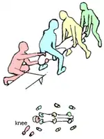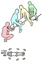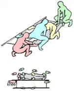 With four first responders (including the chief), the first and second team members step over the casualty and the stretcher, the foot is on the farthest pole of the stretcher. The chief holds the closest pole with his/her knee on the ground, and the third team member with his/her ankle. The positions of the hands are the same as for the vertical lift with five first responders.