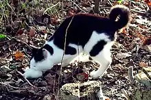 There are several different motor patterns associated with the play behaviour of cats and they have different roles in the social context.[6] Pouncing is used to initiate play through physical contact. Kittens exhibit their preference for physical contact play by rolling and exposing the abdomen and rearing up on the hind legs.[6] Chasing and horizontal leaping are examples of motor patterns that may be used to end play. The varying speed and directional movement of a cat's tail can be a useful indicator of its level of playfulness.