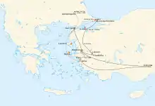 In 1303, the Byzantine Emperor Andronicus II Palaeologus hired 6,500 Catalan mercenaries under Roger de Flor[2] to campaign against the Turks in the spring and summer of the same year. Their costly service came with success, driving back the Turks in parts of Asia Minor.[3] At Philadelphia, 18,000 Turkish soldiers (possibly those of Aydinids) were left dead, the work of the Catalans.