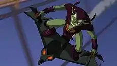 ![]() Green Goblin executes an attack on Spider-Man. In keeping with the show's color scheme, Green Goblin's costume emphasized the color green to coincide with negative aspects in Peter's life. A lot of its design was based on original designs from the 1960s and 70s. | |