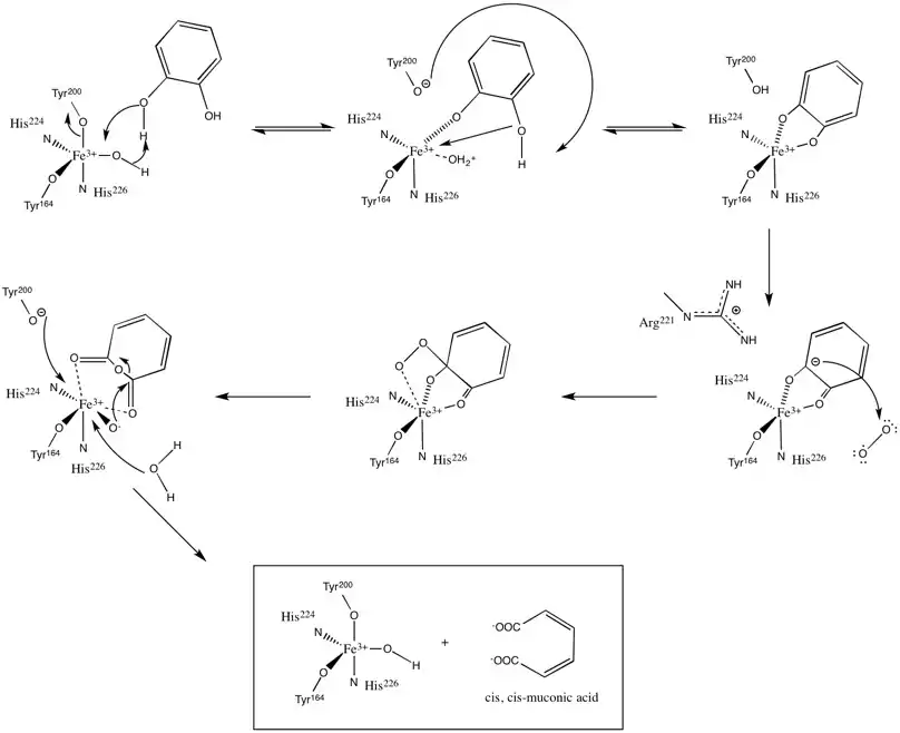 The catalytic mechanism of catechol 1,2-dioxygenase was elucidated using a combination of O18 labeling experiments and crystallography.[27][28][29] Upon entering the active site, the hydroxyl group on the fourth carbon (C4) of catechol binds to Fe3+; this binding is facilitated by the hydroxide ligand, which deprotonates the C4 hydroxyl group. The second catechol hydroxyl group on carbon 3 (C3) is coordinated to Fe3+ after its deprotonation by the Tyr200 ligand. In the process of deprotonating the C3 hydroxyl group, Tyr200 dissociates from the catalytic complex.