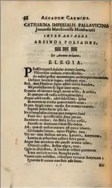 Caterina Imperiale Pallavicini (also spelled "Catharina"; pen name, Arsinda Poliades; fl. 1721) was an 18th-century Neo-Latin (New Latin) poet from the greater Genoa region. Her work, which was published in the collections of the Pontifical Academy of Arcadia (Pontificia Accademia degli Arcadi[1]), includes the styles of epigram and elegy.