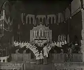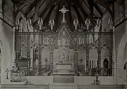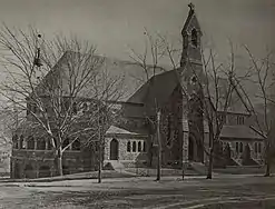 New York architect Edward Tuckerman Potter designed the first church building in and English Gothic Revival style. And so, on August 3, 1863 the cornerstone was laid, and construction began on the parish's first church building. It was completed the following year with the first services celebrated on Christmas Day,[4] and was consecrated on April 19, 1865 by the Rt. Rev. William B. Stevens, then Assistant Bishop of Pennsylvania.