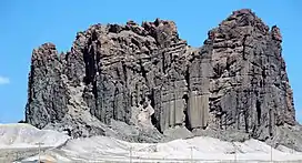 Cathedral Cliff is a 5,810-foot (1,770 meter) elevation volcanic plug located on Navajo Nation land in San Juan County of northwest New Mexico, United States.[3] It is a prominent landmark set alongside U.S. Route 491, approximately 13 miles south of the community of Shiprock, New Mexico. Cathedral Cliff is one of the phreatomagmatic diatremes of the Four Corners area, and with significant relief as it rises 400 feet (122 meters) above the high-desert plain.[4] It is situated about 9.5 miles (15.3 km) southeast of Shiprock, the most famous of these diatremes. Cathedral Cliff is set in the northeastern part of the Navajo Volcanic Field, a volcanic field that includes intrusions and flows of minette and other unusual igneous rocks which formed around 30 million years ago during the Oligocene.[5] Its nearest higher neighbor is Table Mesa, one mile to the southwest, and Barber Peak is set 1.5 mile to the southeast.