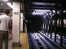 The 110th Street station was constructed as part of the IRT's West Side Line (now the Broadway–Seventh Avenue Line) from 104th Street to 125th Street, for which construction began on June 18, 1900.[10] The section of the West Side Line around this station was originally planned as a two-track line, but in early 1901, was changed to a three-track structure to permit train storage in the center track.[11]: 93 [12]: 189–190 Construction on the section between 104th Street and 125th Street had already begun prior to the design change, requiring that a portion of the work be undone.[11]: 240–241 A third track was added directly north of 96th Street, immediately east of the originally planned two tracks.[13]: 14