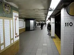 Due to concerns expressed by community groups, the addition of art to this station and the 116th Street station was dropped.[37][38] Between October 5 and November 17, 2003, the downtown platforms at 110th Street and 125th Street were closed to expedite work on their renovations.[40] The original interiors were listed on the National Register of Historic Places in 2004.[2] Skip-stop service ended on May 27, 2005, as a result of a decrease in the number of riders who benefited.[41][42]