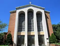 The cathedral is a modern design and is constructed with a basilica floorplan. The exterior is red brick with three doors at the front. The doors are in shallow porticos formed by barrel arches that extend to the roof and contain a stained glass window above each door. The sanctuary houses a three-manual M.P. Moeller organ with 28 ranks of pipes installed in 1961.[1] The organ was redesigned and expanded to 53 ranks in 1980 by organ builder Robert Wyant. Wyant served as cathedral organist from 1964, after two years as assistant organist, until his retirement in 1998.[2]