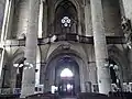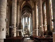 The planned double-tower frontage is represented in the interior by massive pillars with cross profiles, turned into the main nave with pointed half-pillars. The vault under the southern tower is solved with a simple four-pointed star with middle cross ribs. The entrance space is vaulted with a four-pointed star vault complemented with a diagonal cross with pear-shaped supports.