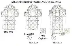 Excavations of Almoina Archaeological Centre have unearthed the remains of the ancient Visigothic cathedral, which later became a mosque.[3] There is documentary evidence that some decades after the Christian conquest of the city (1238), the mosque-cathedral remained standing, even with the Koranic inscriptions on the walls, until 22 June 1262, when the then bishop Andreu d'Albalat [4] resolved to knock it down and build a new cathedral in its place according to the plans of the architect Arnau Vidal.[5] Hypothetically, the ancient Muslim mosque would correspond with the current transept of the cathedral, the Apostles' gate would be the entrance to the mosque and the Almoina ("alms") gate the mihrab.[6]