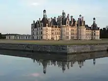 Francis was a compulsive builder. He began extension works at the Louvre,[13] added a wing to the old castle at Blois, and built the vast château of Chambord, which he showed off to the emperor Charles V in 1539. He also transformed the lodge at Fontainebleau into one of the great palaces of Europe, a project that continued under Henry II. Artists such as Rosso Fiorentino and Francesco Primaticcio worked on the interior, alongside French craftsmen.[14] This meeting of Italian Mannerism and French patronage bred an original style, later known as the first School of Fontainebleau.[15] Featuring frescoes and high-relief stucco in the shape of parchment or curled leather strapwork, it became the dominant decorative fashion in France in the second half of the sixteenth century.[16] Catherine later herself employed Primaticcio to design her Valois chapel. She also patronised French talent, such as the architects Philibert de l'Orme and Jean Bullant, and the sculptor Germain Pilon.[1]