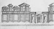 The palace of Saint-Maur-des-Fossés, south east of Paris, was another of Catherine's unfinished projects. She bought this building, on which Philibert de l'Orme had worked, from the heirs of Cardinal Jean du Bellay, after the latter's death in 1560.[66] She then commissioned de l'Orme to finish the work he had begun there. Drawings by Jacques Androuet du Cerceau in the British Museum may shed light on Catherine's intentions for Saint-Maur. They show a plan to enlarge each wing by doubling the size of the pavilions next to the main block of the house. The house was to stay as one storey, with a flat roof and rusticated pilasters. That meant the extensions would not unbalance the masses of the building as seen from the side.[52]