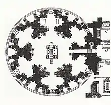 To lead the Valois chapel project, Catherine chose Francesco Primaticcio, who had worked for Henry at Fontainebleau. Primaticcio designed the chapel as a round building, crowned by a dome, to be joined to the north transept of the basilica. The interior and exterior of the chapel were to be decorated with pilasters, columns, and epitaphs in coloured marble. The building would contain six other chapels circling the tomb of Henry and Catherine.[25] Primaticcio's circular design solved the problems faced by the Giusti brothers and Philibert de l'Orme, who had built previous royal tombs. Whereas de l'Orme had designed the tomb of Francis I to be viewed only from the front or the side, Primaticcio's design allowed the tomb to be viewed from all angles.[26] Art historian Henri Zerner has called the plan "a grand ritualistic drama which would have filled the rotunda's celestial space".[27]